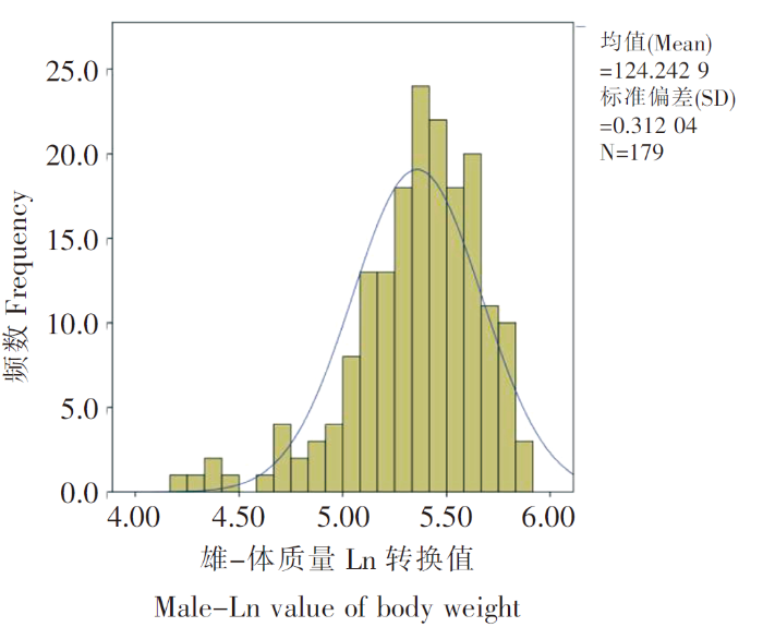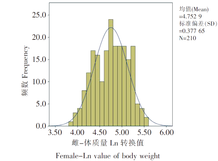 数据预处理和初步统计分析在SPSS 16.0软件上完成,利用线性回归(Linear regression)模块的Casewise diagnostics项对原始数据进行奇异值检测;并利用Descriptive statistics和Histogram模块对数据进行描述性统计、正态性检验和频率直方图制作。为了满足后续方差分析的要求,利用Transform模块对偏离正态分布(Shapiro-Wilk,P<0.01)的原始数据进行自然对数(Ln)转换并生成新变量。