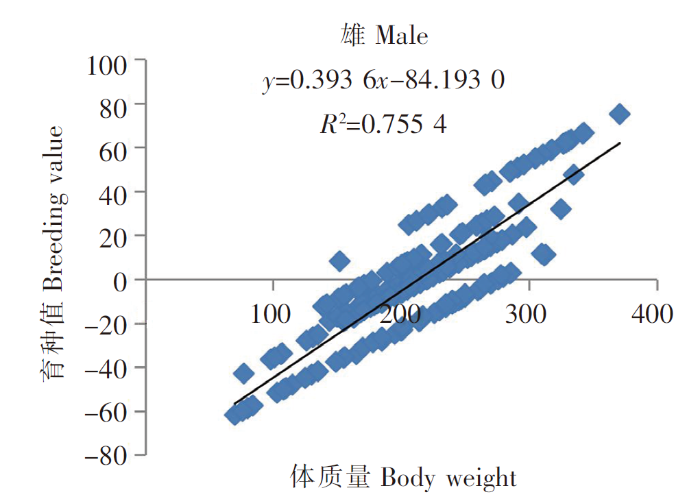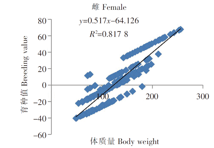 体质量作为大刺鳅的家系选育主要形态学指标与性别具有明显的相关性,因此在今后的育种中应考虑性别的因素。从本研究的分析结果看,雌雄育种值最高的个体均出现在全同胞家系B中,PIT-900111881517645雄鱼育种值最高,为75.09,PIT-900111881517648雌鱼育种值最高,为67.49;其次,全同胞家系E中PIT-900219000981542雄鱼育种值最高,为47.51,PIT-900219000981477雌鱼育种值最高,为37.47。以上2个家系育种值较靠前的个体,可作为下一代繁育的主要亲本,进行跨家系自由组合配对,提升下一代大刺鳅个体的生长性能。