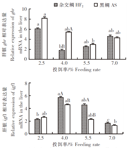 不同投饵率下杂交鲷及黑鲷ghr 和igf1 基因相对表达量的比较