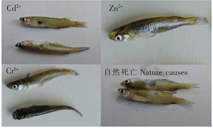 图1所示为翘嘴鲌幼鱼受重金属离子Cd2+、Zn2+ 、Cr6+胁迫中毒与自然死亡的症状对比。