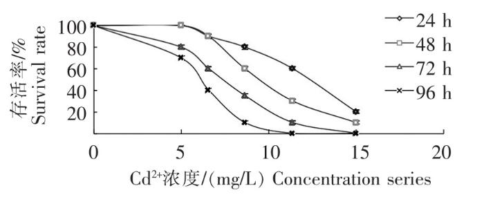 Cd2+ 6个浓度组不同时间下的幼鱼存活率