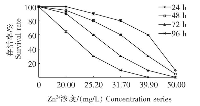 从图3可见,当Zn2+为低浓度20.00 mg/L时,各个时间点存活率相对较高,均≥65%;在20.20 mg/L、31.70 mg/L两浓度组区间,24 h和48 h的存活率下降较平缓,而毒物胁迫时长在72 h及以上时出现陡降。在Zn2+为50.00 mg/L时,试验开始短时间内即出现大量死亡;未达72 h已无一存活。