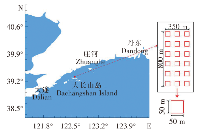 北黄海海域是位于山东半岛、辽东半岛和朝鲜半岛之间的半封闭的陆架浅海,受北上的黄海暖流和季节性黄海冷水团作用,再加上鸭绿江等河流的淡水汇入,海陆的相互作用比较强烈,导致该海域生态系统复杂多样[22]。大长山岛位于辽东半岛东南、长山群岛北部,海域面积651.5 km2。大长山岛的东北部海域属于内陆浅海,海水水温有明显的季节性变化,潮流特征为正规半日潮,呈旋转流型,以逆时针旋转为主;该海域平均水深15 m,最深可达25 m,海水由北向南逐渐加深,海底绝大部分为软泥质,岛屿四周海底有岩礁、石砾和贝壳,底质适合开发底播养殖活动,在该海域投放人工鱼礁有利于虾夷扇贝的养殖。因此,在大长山岛的东北部海域积极开展人工鱼礁选址及规划布局,目的是增强该海域的生态功能和渔业资源养护,确保海域的可持续发展,具体研究区域如图1所示。根据设计规划,在大长山岛东北部附近海域投放人工鱼礁,该区域计划投放人工鱼礁用海面积4.5 hm2,人工鱼礁采用聚堆投放,共形成18个单位礁,每个单位礁分别由310个单体礁双层投放形成,高度不超过4 m;单位礁底部均为50 m×50 m的方形,单位礁矩阵式分布在鱼礁区,礁区单位礁之间间距为距东、西、南、北各约100 m,水深12~13 m,鱼礁区如图1所示。