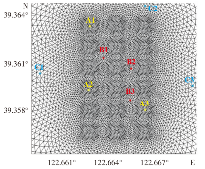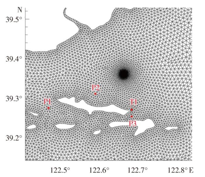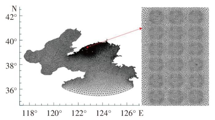 岸线数据从Google Earth上提取,利用SMS(Surface-water model system)软件制作三角形网格,研究区域计算网格总数为65 472,节点数为33 703,网格最大分辨率为22.2 km,位于外海开边界处,最小分辨率为10 m,位于投放人工鱼礁海域,具体网格布置见图2。模型边界共有3种类型,渤海及北黄海陆地与海洋交汇处边界是闭边界,属性为陆地;北黄海外海约36°N处为开边界,属性为海洋;研究区域中诸多岛屿处,属性为岛屿。地形数据一部分采用GEODAS软件中ETOPO1数据集中提取,分辨率为1',另一部分采用基于85高程的实测水深数据,该数据覆盖了本文主要研究海域,且具有数据较准、精度较高的特点。本文模型采用冷启动,三维斜压模式,外模时间步长为0.01 s,内模与外模时间步长比率为10,模型每h输出一次结果,模型模拟时间为2019年4月1日0时至2019年5月1日0时。垂向采用Sigma分层方式,均分为10层,其中第1层为表层,第5层为中层,第10层为底层。利用MIKE21提取模型外海开边界数据,采用潮位驱动用于后续的模拟计算。本次模拟未考虑风场、波浪和热通量的影响。人工鱼礁采用密闭固化的方式进行处理,以人为将人工鱼礁区水深加高4 m的方式用于后续的数值模拟计算,在除水深外其他因素水平都相同的条件下再次进行模拟,通过投放人工鱼礁前后模拟结果,对比分析投放人工鱼礁对其周围海域水动力环境的影响。