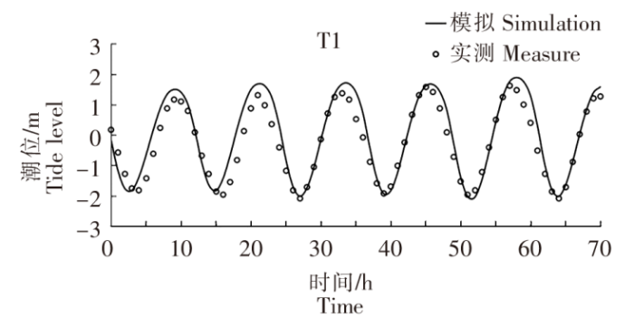 本文首先对研究区域人工鱼礁投放前的水动力特征进行模拟计算,选取潮位验证点(T1)及3个潮流验证点(P1、P2、P3)的潮位、深度平均流速、流向对模型进行验证,各站位具体坐标见图3。潮位验证资料取自2019年4月5日0时—2019年4月7日23时的实测数据,潮流验证资料取自2019年4月5日16时—2019年4月6日17时(大潮期)、2019年4月14日15时—2019年4月15日16时(小潮期)的实测数据。潮位模拟结果对比见图4,由图可以看出,该海域的潮汐为正规半日潮,最大潮位为1.89 m,最低潮位为-2.06 m,潮位模拟值与实测值平均偏差小于0.20 m,模拟值与实测值相关系数为0.96。