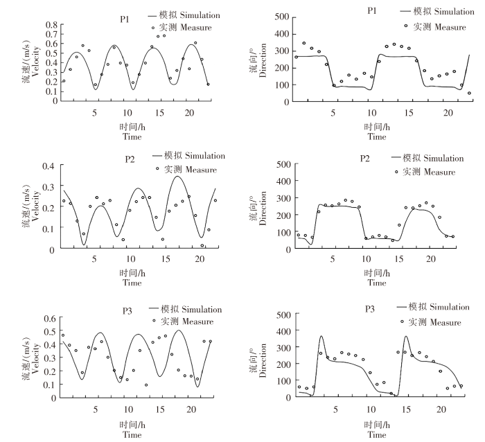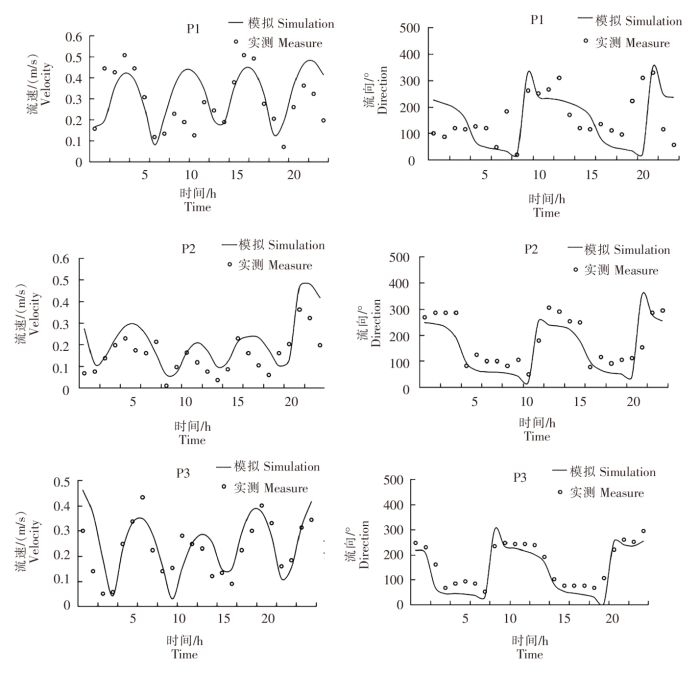 小潮期和大潮期的流速、流向对比分别见图5、图6,小潮期3个测点P1、P2和P3的最大实测流速分别为0.507、0.229、0.434 m/s,平均实测流速为0.401、0.171、0.292 m/s;大潮期3个测点P1、P2和P3的最大流速分别为 0.679、0.341、0.462 m/s,平均实测流速为0.283、0.132、0.227 m/s,各站点大潮期的最大流速均大于小潮期。大小潮期P1、P2、P3站点流速的绝对误差分别为0.095、0.062、0.101 m/s,流向相对误差分别为11.551%、6.193%和4.079%。结果表明,流速、流向模拟值较实测值误差略大,主要是由于P1、P2、P3站点位于岛屿附近,实际地形变化较大,而此处网格分辨率不够高,导致水深数据经反向距离插值与实际地形相比不够精准。总体来说,潮流模拟值与实测值总体趋势吻合,误差在可接受范围内。