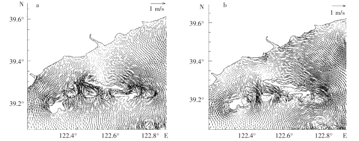 Simulated flow patterns in periods of flood tide (a) and ebb tide (b)