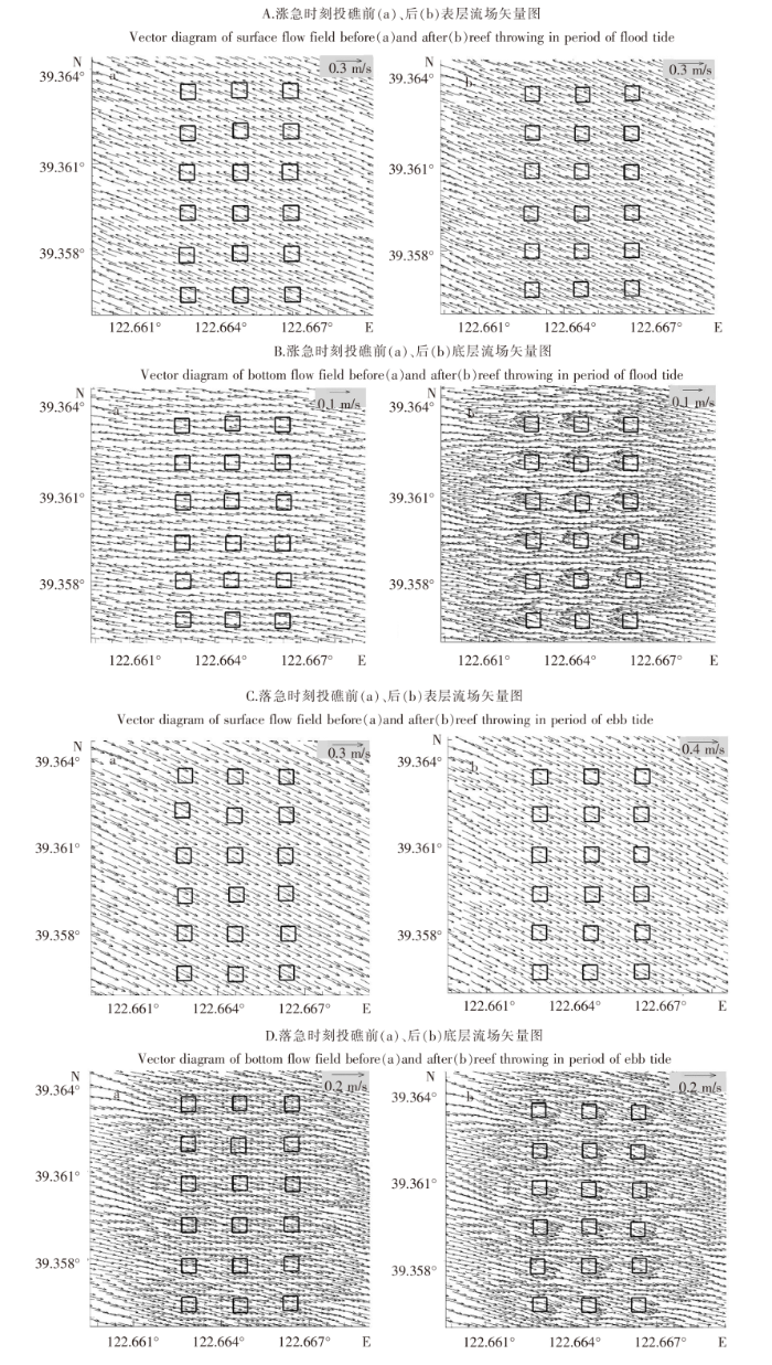Variation of surface flow velocities before and after reef throwing in period of flood tide(a)and ebb tide(b)