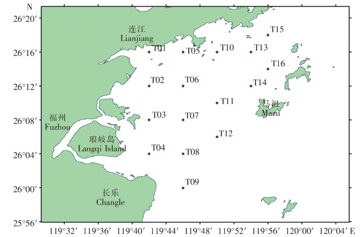 本文数据来源于2021年3月、5月、7月和8月在闽江口(119°40' E~120°00' E、26°00' N~26°20' N)开展的4个航次渔业资源调查(图1),3月和5月(春季)的调查站位为T01~T12,7月和8月(夏季)的调查站位为T01~T16,每站拖曳时间20~60 min,数据计算之前都标准化至1 h,平均拖速约为3.0 kn。调查船为当地生产性渔船,主机功率64 kW、总吨位44 t,调查网具为底拖网,网具扫海宽度为10 m,网囊网目尺寸为3.0 cm。调查按照GB 12763.6—2007《海洋调查规范 第6部分:海洋生物调查》[14]进行。鱼类种类鉴定主要参考《福建鱼类志》[15-16]等,鱼类适温性及生态类型参考《福建省渔业资源》[17] 等。