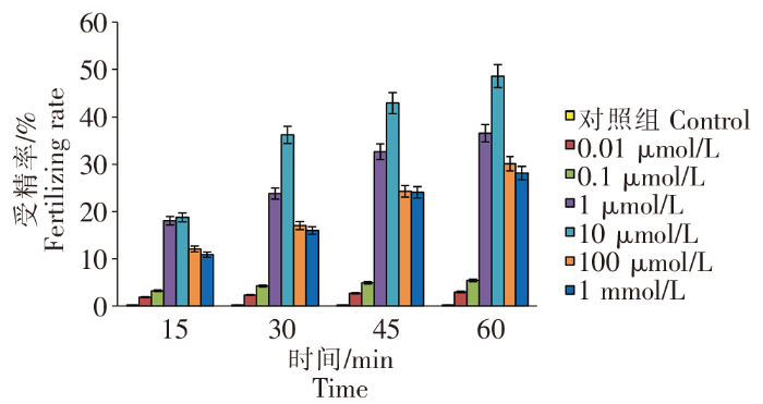 钝缀锦蛤的卵母细胞经过不同浓度5-HT浸泡处理后,人工授精的受精率见图3。卵母细胞经过5-HT浸泡后,可以显著提高受精率(P<0.05)。除了0.01~0.1 μmol/L 5-HT实验组外,其他实验组(1 μmol/L~1 mmol/L 5-HT)表现出一定的时间依赖关系,受精率随时间增加而提高。当处理时间相同时,表现出一定的浓度依赖关系,1~10 μmol/L 5-HT实验组的受精率显著高于其他实验组(P<0.05);其中,10 μmol/L 5-HT浸泡60 min实验组受精率最高,达到48.57%。