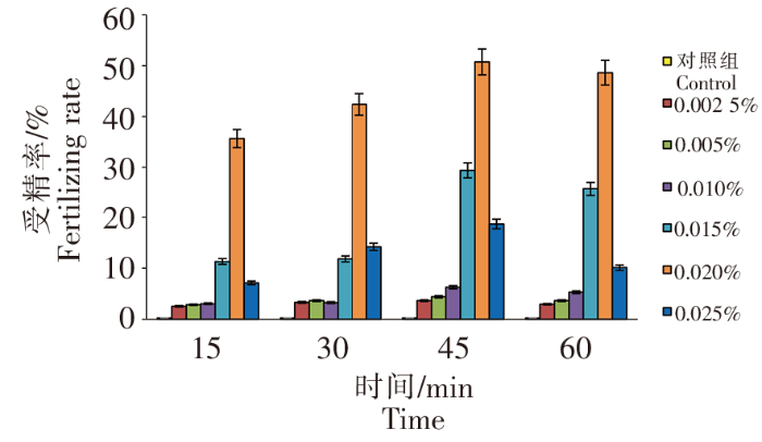 钝缀锦蛤的卵母细胞经过不同浓度氨海水浸泡处理后,人工授精的受精率见图5。卵母细胞经过氨海水浸泡后,可以显著提高受精率(P<0.05)。除了0.002 5%~0.005%、0.025%氨海水实验组外,其他实验组(0.015%~ 0.020%氨海水)表现出一定的时间依赖关系,15 min至45 min时间内受精率随时间增加而提高。当处理时间相同时,表现出一定的浓度依赖关系,0.015%~0.025%氨海水实验组的受精率显著高于其他实验组(P<0.05);其中,0.020%氨海水浸泡45 min实验组受精率最高,达到50.75%。