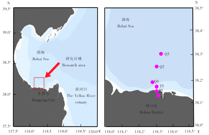 如图1所示,根据东营河口区附近的贝类养殖区的分布状况,本次调查在滩涂和浅海区域各设置了3个平行调查站位。其中T1、T2和T3站点位于滩涂区(涨潮时水深1.0~1.5 m);Q1、Q2和Q3站点位于浅海区(水深7~14 m)。