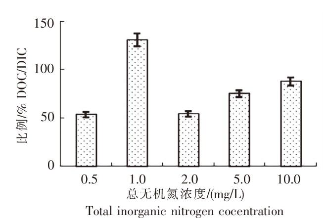 不同总无机氮浓度下羊栖菜小苗的DOC分泌量占固碳量的比例
