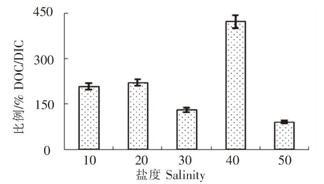 实验结果(图5、图6)显示:1)羊栖菜小苗DOC分泌速率在10盐度下为43.61mg/(kg·h),随盐度增加先升高后下降,在30盐度下最高[132.58 mg/(kg·h)],在50盐度下最低[40.18 mg/(kg·h)]。2)羊栖菜小苗DIC固定速率在低盐度10条件下最低,为22.75 mg/(kg·h);在30盐度下最高,达100.60 mg/(kg·h);在盐度40和50条件下,保持在较低值,分别为25.47 mg/(kg·h)和45.58 mg/(kg·h)。3)在盐度40条件下,较高的DOC分泌速率95.60 mg/(kg·h)和较低的DIC固定速率25.47 mg/(kg·h),使得羊栖菜小苗DOC分泌量占固碳量的比例最高,达423.34%;50盐度最低,为83.48%。结果表明,30左右的盐度最有利于DOC的分泌和DIC的固定。这可能是在长期生存进化过程中,羊栖菜适应了自然海水30左右的盐度,藻体内各种酶在此盐度下活性也最高,因此其正常的新陈代谢也最为旺盛。