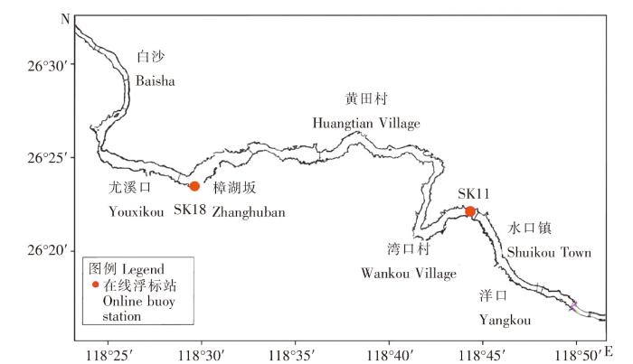 研究区域选择福建省樟湖镇和古田县的淡水水产养殖重点水域,水质数据来自两个在线浮标站位SK11、SK18,其中SK11站位(118°44'19.95″E、26°22'32.73″N)位于宁德市古田县水口镇水域,SK18站位(118°29'37.76″E、26°23'28.54″N)位于南平市延平区樟湖镇水域(图1),监测水深为0.5 m。气象数据来源于中国气象网。水质指标包括DO、水温、pH、叶绿素a、浊度、电导率、氨氮浓度和亚硝酸盐氮浓度,监测时间为2022年1月到6月,其中水温、pH、叶绿素a、浊度、电导率监测频次为1 h/次,氨氮浓度和亚硝酸盐氮浓度的监测频次为4 h/次;气象指标包括湿度、风速、风向、气压、能见度和平均总云量,监测时间为2022年1月至6月,监测频次为1 h/次。为了统一样本时间尺度,提高结果的准确性,模型构建前通过去除异常值和插值法来预处理数值因子数据,将氨氮浓度和亚硝酸盐氮浓度的频次科学地转化为1 h/次,与气象数据频次一致,统一样本数据频次。