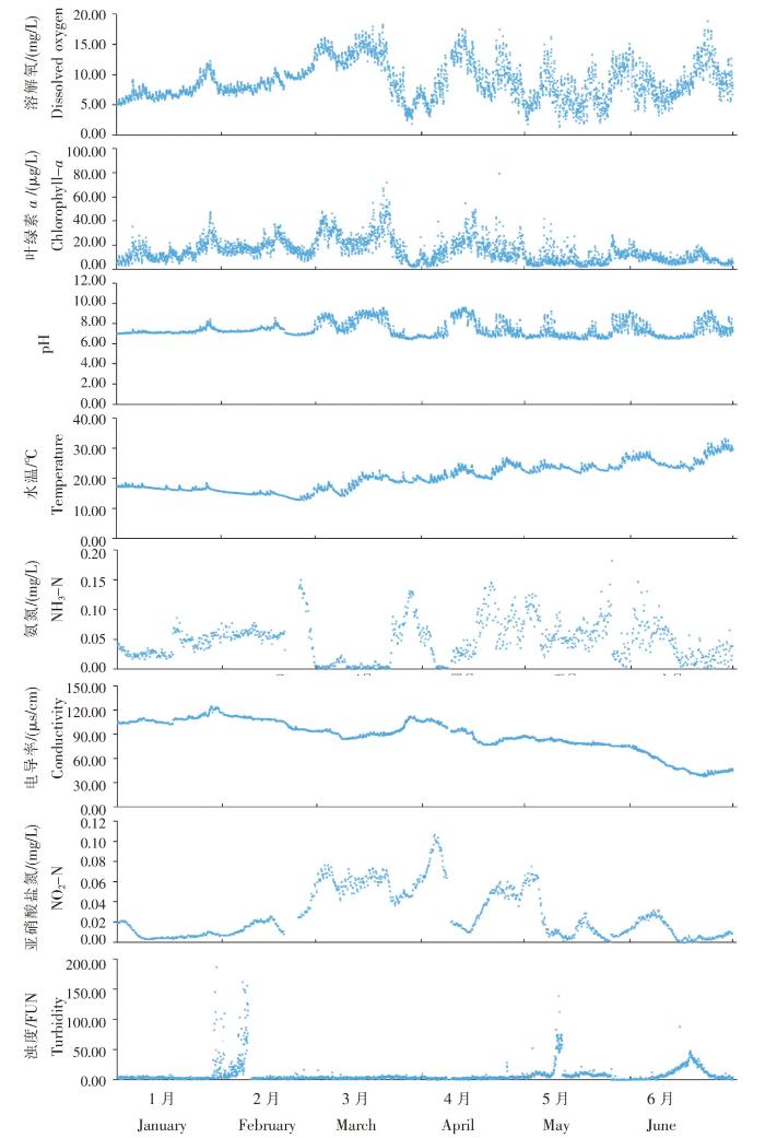 SK11站位DO浓度区间为2~14 mg/L,叶绿素a浓度区间为3~90 μg/L,两者变化趋势相似;随着气温回暖,藻类等植物大量生长,1—3月DO和叶绿素a浓度逐渐升高,均在3月出现最高值,其中DO浓度最高为14 mg/L,叶绿素a浓度最高为90 μg/L;随后可能受降雨等因素影响,DO和叶绿素a浓度降低,但天气好转,又继而升高,总体来说,4—6月DO和叶绿素a浓度呈波动变化。pH的变化区间在6.3~8.7之间,呈弱酸弱碱性,分布较为平均,个别天数受多种因素影响而出现波动。在1—6月之间,随着时间推移,水温逐渐升高。氨氮浓度和亚硝酸盐氮浓度在1—6月分布较为杂乱,无明显规律。电导率主要与温度、悬浮物含量与水体中阴阳离子含量等有关。5—6月水温过高,导致水体电导率下降严重,其余月份水温较低,因此电导率普遍偏高。