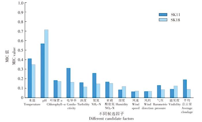 综上所述,候选因子经过MIC的识别和筛选后,在构建混合MIC-BP神经网络模型时,SK11、SK18站位的输入因子为pH、水温、叶绿素a、电导率、浊度、氨氮浓度和亚硝酸盐氮浓度。