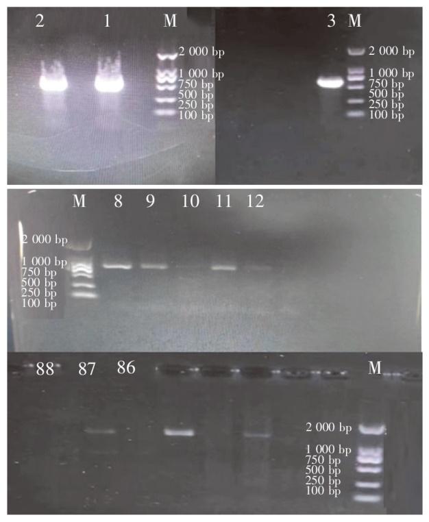 Notes: M indicated 2 000 bp DNA ladder; 1~5 samples of C.gigas were from Zhangpu A hatchery; 8~10 samples of C.gigas were from Zhangpu B hatchery; 11~15 samples of C.angulata were from Zhangpu C hatchery; 86~88 samples of C.angulata adult were from Zhangpu sea area.