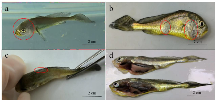 注:图中红色圆圈代表大黄鱼病变组织。a.头部发白;b.体表局部块状泛白,鳃盖充血;c.背鳍发白;d.剖检,上为健康大黄鱼,下为患病大黄鱼。