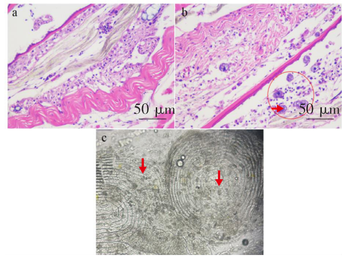 注:图中箭头代表盾纤毛虫。a. 健康鱼;b. 患病鱼;c. 4倍显微镜下的体表黏液盾纤毛虫。