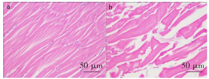 如图4所示, 健康大黄鱼肌肉组织中肌细胞排列紧密、条纹清晰,细胞核位于细胞边缘。患病大黄鱼肌细胞着色不均匀,大部分区域浆溶解,肌原纤维明显断裂、弯曲不齐,肌纤维间隙增大。