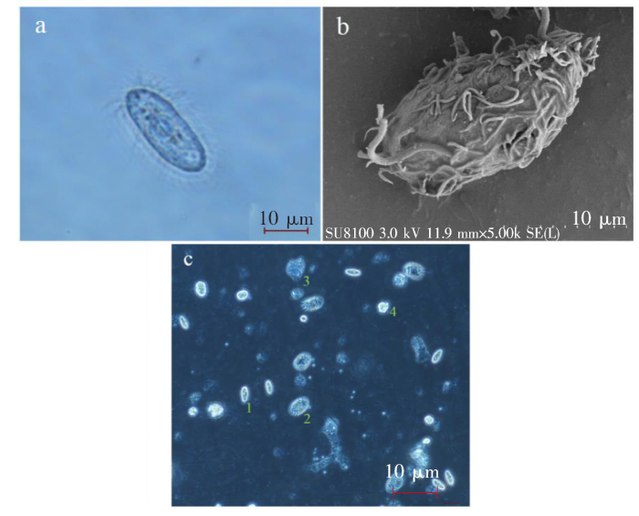 由图5可知,虫体外形为饱满的水滴状,皮膜薄而无缺刻,顶端略尖,常向后背弯曲,后端浑圆,周身长有纤毛,体排列稀疏;虫体大小约(20~35)μm×(10~20)μm,体内具有多个2~5 μm 的圆形食物泡,细胞质无色,显微镜下可见位于中央区的不透明大核,呈圆形,体后端含有一个透明的伸缩泡和一根长鞭毛。通过活体甲醛国定显微镜及扫描电镜观察,初步分析及推测该盾纤毛虫可能为水滴伪康纤虫(Pseudocohnilembus persalinus)。