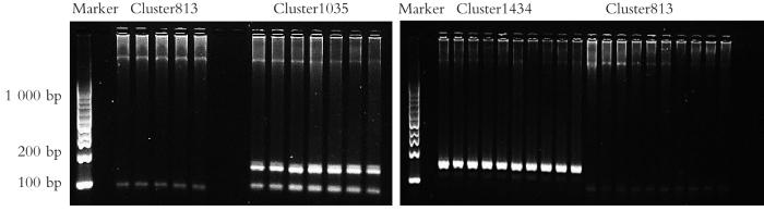 通过ebwt2InDel软件从WY_4和NN_5两个样本的测序数据中寻找包含InDel标记的序列779条。通过本实验室开发的无参考基因组SSR开发方法从779条含InDel标记的序列中筛选出含多态性SSR的序列137条,去除包含复合型SSR的序列26条,最终得到包含完美型SSR的序列111条。以包含完美型SSR的111条序列为模板,利用SSRgenotyper软件对5个群体共30个样本进行SSR分型。测序分型结果显示,111条含SSR的序列中,共有19个SSR可以成功分型,分型成功率为17.12%。分型成功的19个SSR均为3碱基重复4~6次,其中以ATC/ATG为单位的重复序列占比最多,为6个(31.58%)。利用引物设计软件Primer3针对分型成功的19个SSR序列设计了引物19对(表1)。采用TouchDown PCR对其中3对引物进行了PCR验证。由于Cluster813下游引物的GC含量少,Tm值较低,因此PCR验证中将退火温度降低至48 ℃。由图1可见,3对引物均可扩增,扩增产物大小与预期大小基本一致。