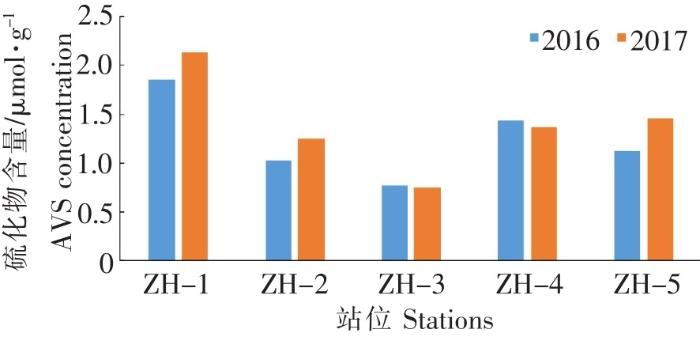 1)樟湖库湾表层沉积物AVS含量范围在0.57~2.13 μmol·g-1之间,梯度分布为ZH-1>ZH-4>ZH -5>ZH-2>ZH-3,网箱养殖活动对底质AVS的积累具有一定的影响。SEM6含量范围在1.66~6.35 μmol·g-1之间,梯度分布为ZH-3>ZH-1>ZH-2>ZH-4>ZH-5,ZH-1、ZH-2、ZH-3站位所在区域邻近樟湖镇生活区且水深较浅,ZH-4、ZH-5站位所在区域周边人类活动较少,SEM的空间分布特征表明重金属的积累主要受陆源输入污染的影响。SEM梯度表现为Zn>Cr>Cu>Pb>Ni>Cd,分布模式主要由Zn控制(贡献率超过50%),Zn、Cr、Cu是主要污染重金属。年际间比较表明,各站位2017年SEM6含量较2016年均有不同程度的上升,重金属污染有可能出现积累。