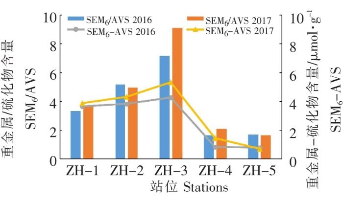 以SEM/AVS比值法预测沉积物重金属的生物有效性,在SEM/AVS<1时,预测结果是肯定的,但是当SEM/AVS>1时,预测结果可能过高估计了重金属的生物有效性[7,24]。有研究表明,在SEM/AVS>1时,并不是所有的的沉积物都能引起生物毒性,因为沉积物中还存在许多其他形式重金属的结合态(如有机物结合态)等[24],重金属生物有效性还会受其他因素影响。因此在本研究区域6种重金属SEM6/AVS>1的情况下,进一步结合美国环保署(EPA)的(SEM-AVS)差值比较法[25]进行评价,即差值(SEM-AVS)>5为第一类,重金属对水生生物可能有高毒性;0<(SEM-AVS)<5为第二类,重金属对水生生物可能有中等毒性;(SEM-AVS)< 0为第三类,重金属对水生生物无不良影响,从年平均值来看,(SEM6-AVS)基本在0~5之间,据此推断总体上重金属对水生生物处于中等毒性水平。