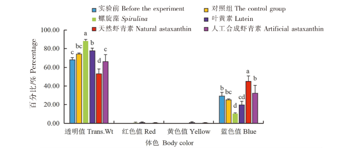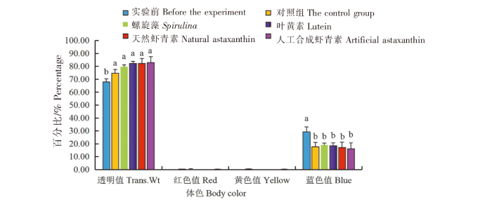 在蓝色品系中:1)天然虾青素组中华锯齿米虾体色的透明度值(Trans.Wt)最低(53.02%),与实验前、对照组、螺旋藻组、叶黄素组和人工合成虾青素组相比差异显著(P<0.05)。2)各组中,中华锯齿米虾体色的红色值(Red)和黄色值(Yellow)均无显著差异(P>0.05)。3)天然虾青素组中华锯齿米虾体色的蓝色值(Blue)最大(77.73%),与实验前、对照组、螺旋藻组、叶黄素组和人工合成虾青素组相比差异显著(P<0.05)(图4)。