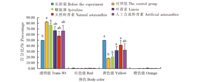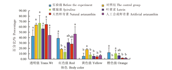 在黄色品系中:1)天然虾青素组中华锯齿米虾体色的透明度值(Trans.Wt)最低(31.17%),与实验前、对照组、螺旋藻组和人工合成虾青素组相比差异显著(P<0.05),与叶黄素组相比无显著差异(P>0.05)。2)各组中华锯齿米虾体色的红色值(Red)无显著差异(P>0.05)。3)天然虾青素组中华锯齿米虾体色的的黄色值(Yellow)最大(77.73 %),与实验前、对照组、螺旋藻组和人工合成虾青素组相比差异显著(P<0.05),与叶黄素组相比无显著差异(P>0.05)。4)各组中华锯齿米虾体色的橙色值(Orange)无显著差异(P>0.05)(图3)。
